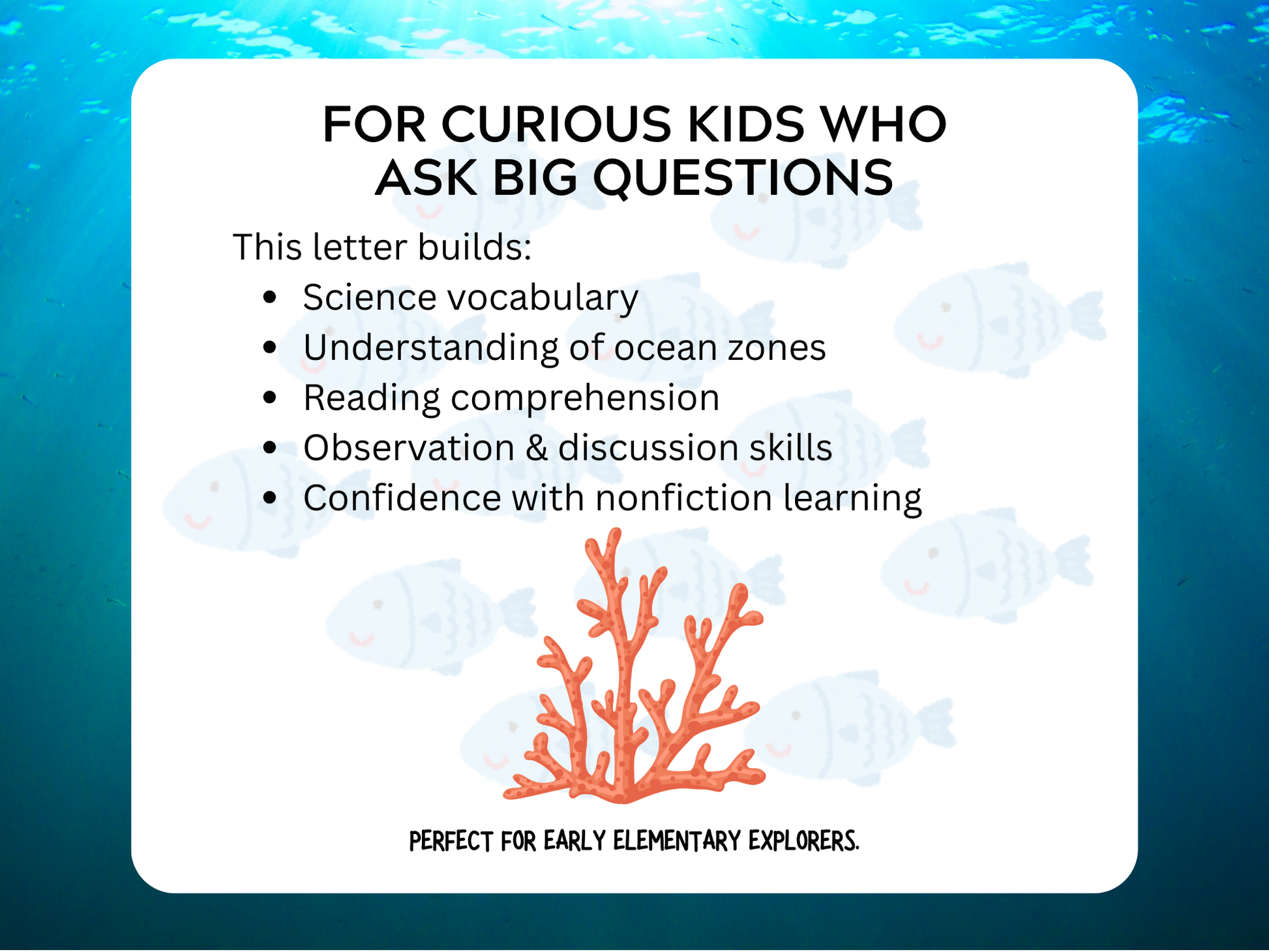 This thoughtfully written digital letter is filled with engaging, kid friendly information, real world photos, and charming illustrations that bring marine science to life. Inside, children will learn about the different ocean zones, how sunlight disappears as you go deeper, why pressure increases, and how amazing animals like glowing jellyfish, giant squid, and deep sea fish adapt to extreme environments - all explained in a warm and easy to understand way.